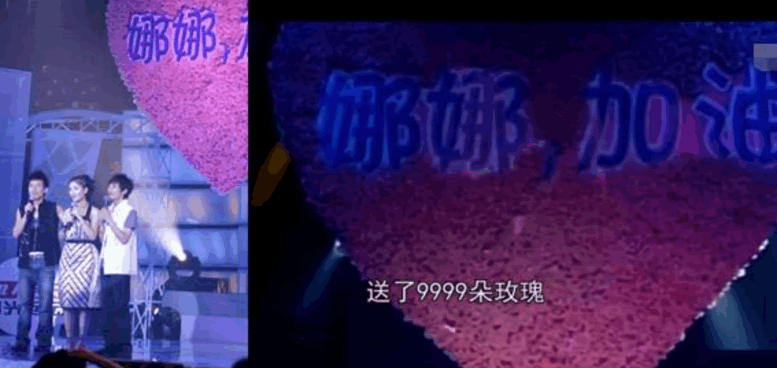 刘烨送来了用9999朵玫瑰制成的心形灯牌。“娜娜加油”四个字在舞台上夺目地闪耀着。