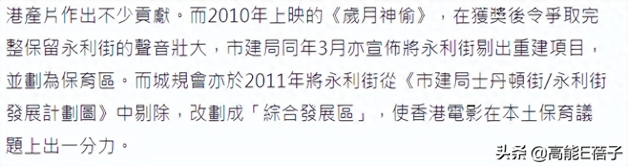 《岁月神偷》2010年上映后获奖无数,令争取完整保留永利街的声音壮大,市建局同年3月亦宣布将永利街剔出重建项目,并划为保育区。第二年,城规会将永利街重建规划里剔除,改划成“综合发展区”。