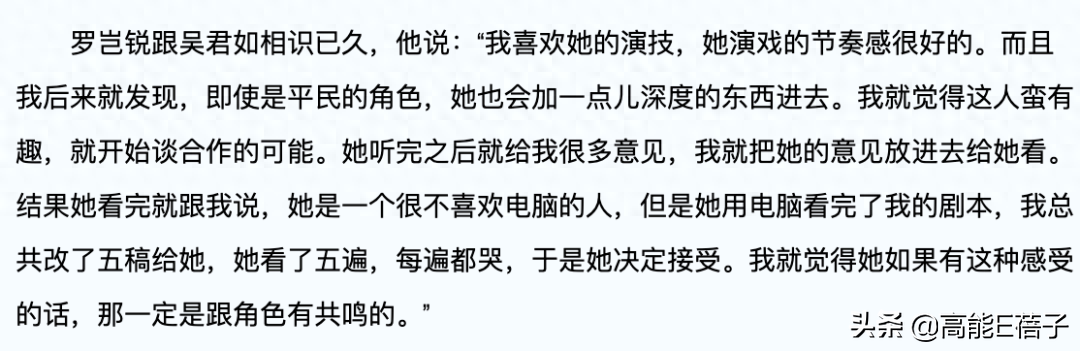 最初,他喜欢的是吴君如的演技和演戏节奏,后来他发现吴君如即使平民角色也会加一点深度的东西进去,很有趣,于是开始和她谈合作可能。