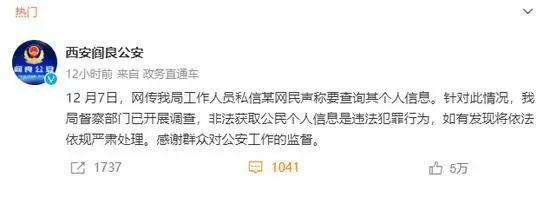 12 月 7 日晚,一网民发文称,一名疑似西安阎良公安系统内的警务人员通过微博私信威胁自己,并声称可以查到自己的个人信息。