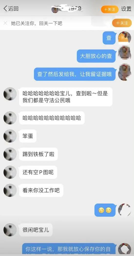 根据该网民发布的私信截图,一位 ID" 别感动 999" 的网民通过私信威胁其 " 不要让我查到你的 ID 哦 "" 我说能查到就能查到,还能查到你的开房记录啥的 " 以及 " 查到啦 " 等。