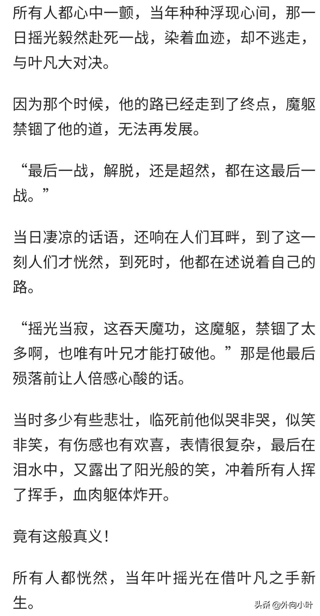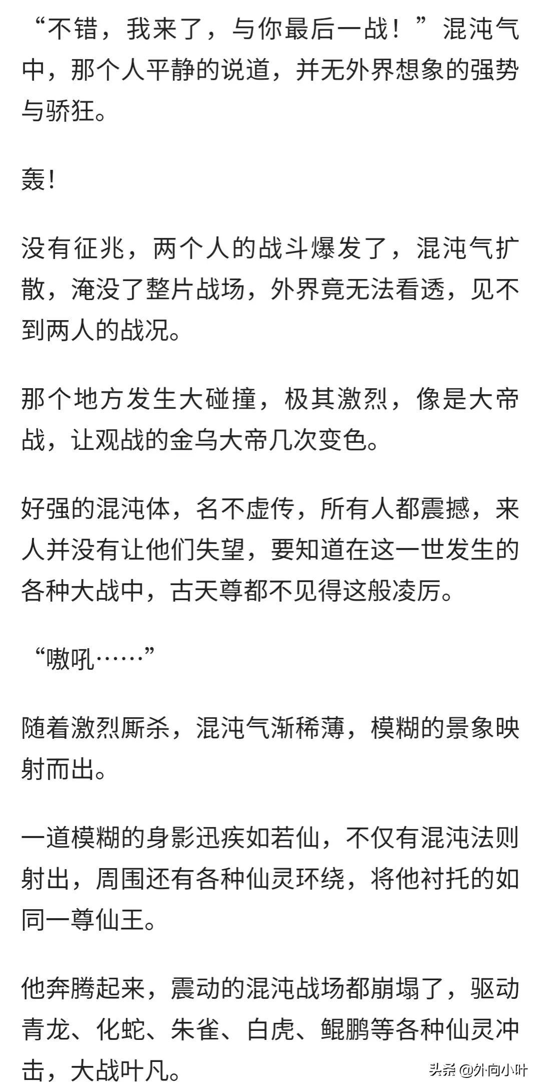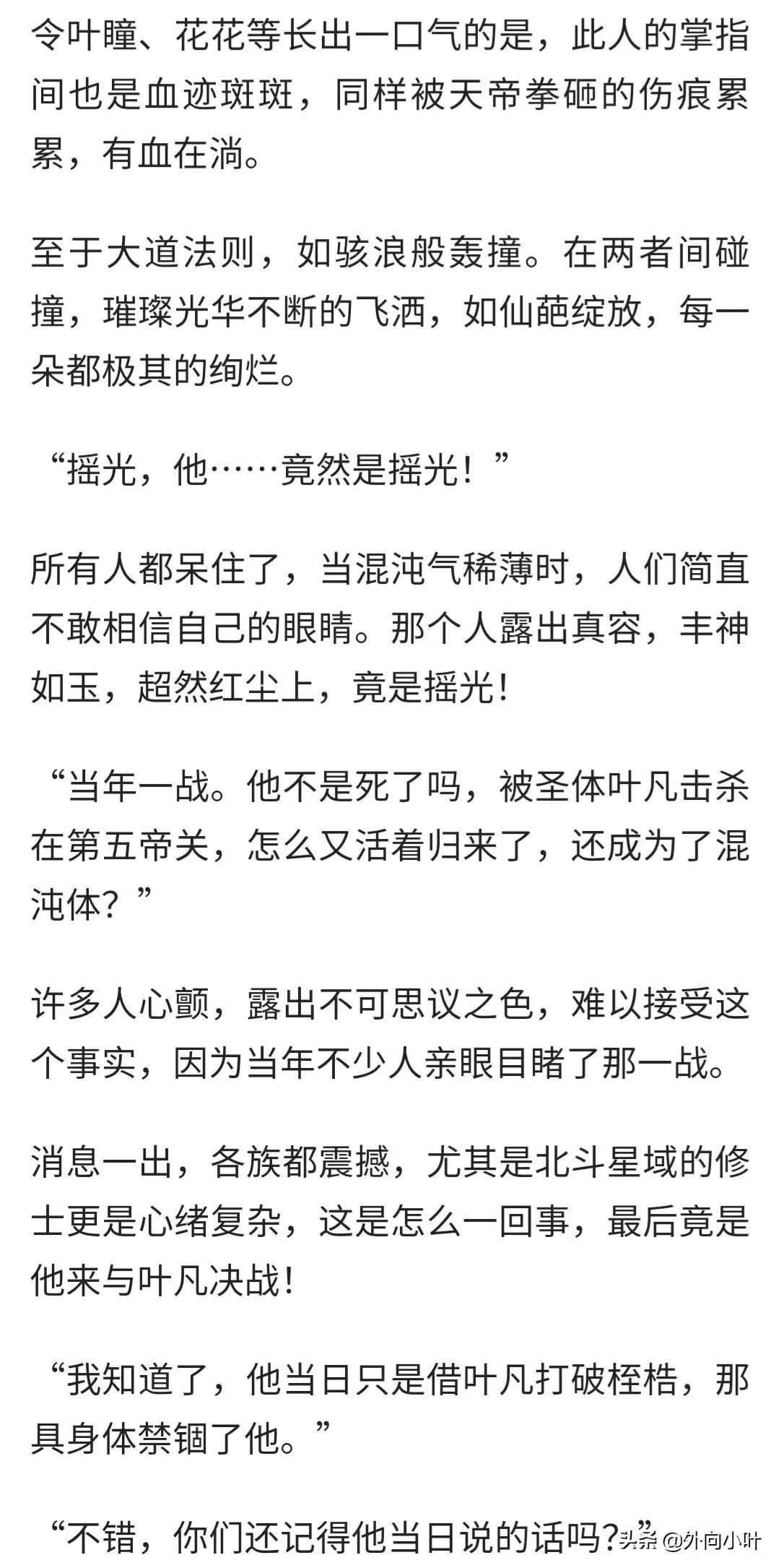 摇光在小说中出手的次数很少,前期基本上都是以分身行走天下,从而导致大家基本上都不了解他,从他和叶凡前期的几次大战中可以看出摇光的实力还是很强的,每次都能从容离去,叶凡也大概猜到了他的身份,到了最后摇光终于堂堂正正和叶凡大战了一场,我们从原文来了解一下大战的场景。