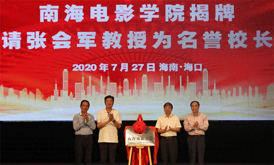 仪式上,黎岳南副厅长、张会军教授、曹成杰董事长、海经院校长陈啸共同为南海电影学院揭牌。国际著名导演张艺谋、陈凯歌、张国立,北京电影学院媒体学院院长宿志刚、副院长程穑及表演学院原院长陈浥,配音大师詹泽,著名演员谢园、梁天、葛优等影视行业知名人士送来视频祝福。