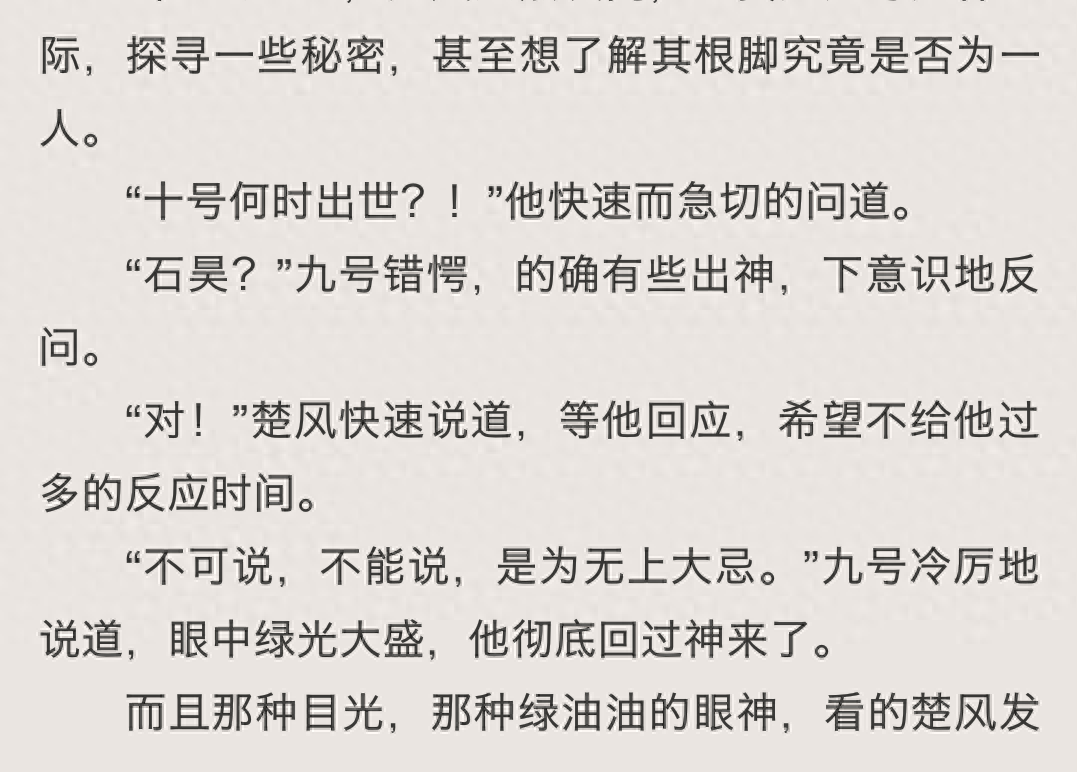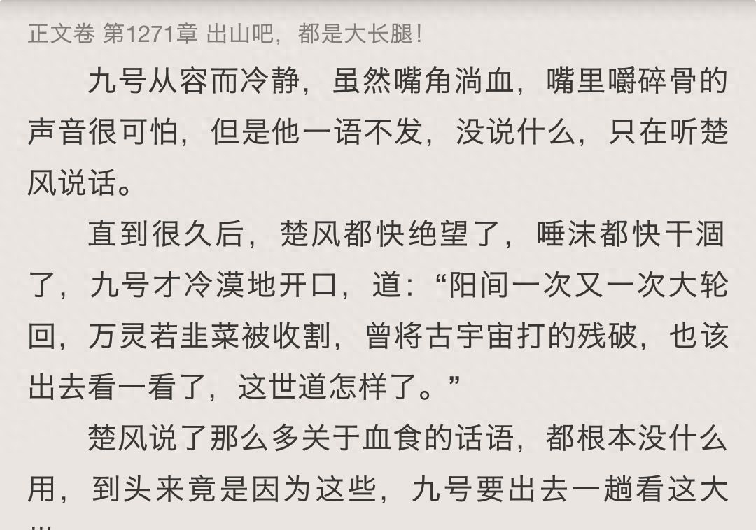 上图中,楚风问及九号十号何时出世,九号错以为说的是石昊,回了一句,不可说不可说,是为无上大忌,这是绝对的实锤了,实的不能在实了。以后再有人说三本书没关系,小编都看不下去了,还有一些网友说这是辰东的笔误,反正小编我是不相信的,其实在圣墟中很多地方都提到了荒天帝,荒在边荒古城试炼地中就留有痕迹,还有楚风的种子每次晋级演化的都是叶凡狠人等人的兵器。还记得小阴间的伏荒,楚风就说过他的名字是犯了大忌讳,劝他改名不然早晚出问题,这个情节正是跟上图内容呼应。书中还暗示过六耳猕猴的祖宗被德字的辈的人坑过,估计就是段德坑的那个六耳猕猴。书中还有一些线索,比如仙瀑就是界海形成的,因为楚风的神秘小矛和荒曾经抛入界海的小矛极其相似,