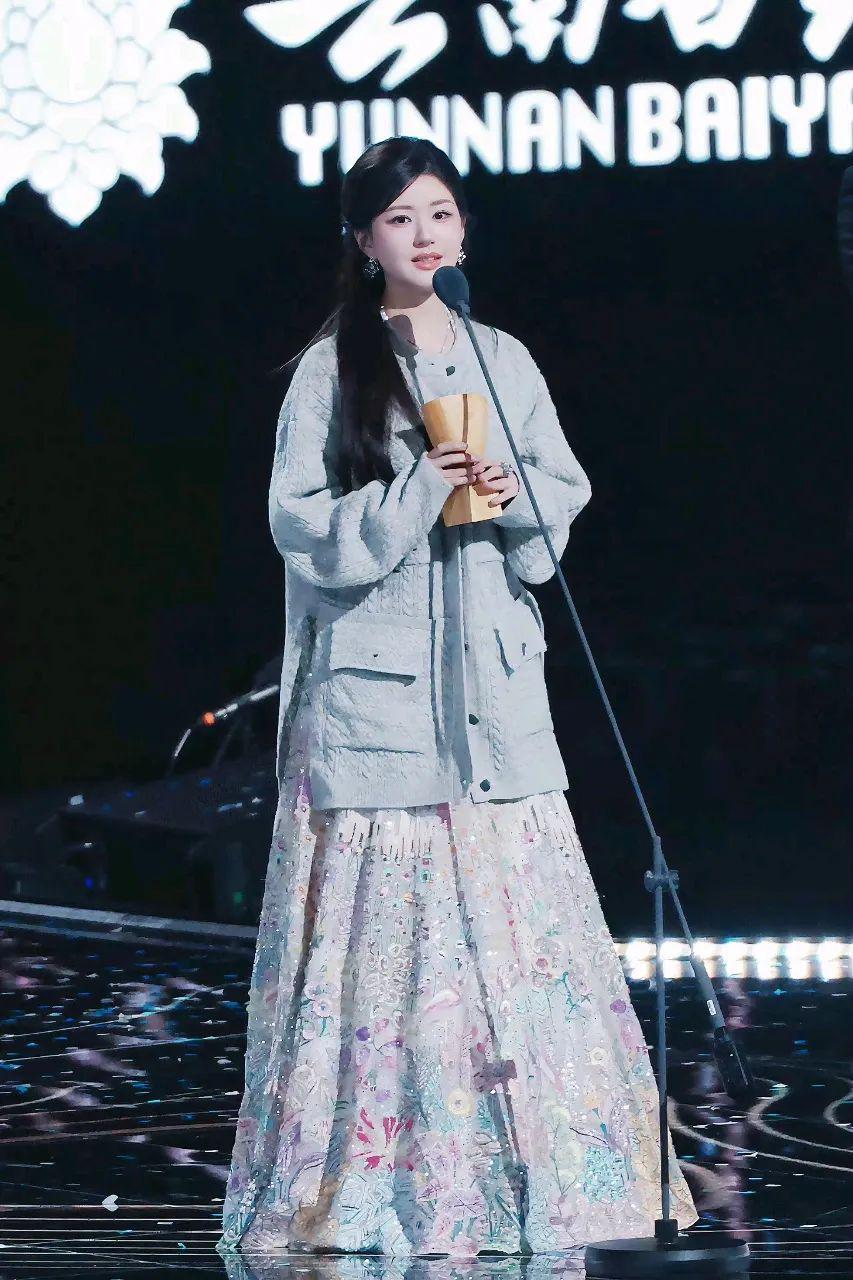 赵露思上台领奖,结果走到一半发现忘记脱毛衣外套了,