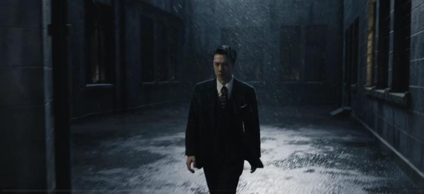 片中,叶先生和日本人去捣毁了地下党的一个据点(其实地下党交通站很早就得到消息车撤走了,被杀的是无辜的平民),西服领带被淋湿,回来换了一套衣服。