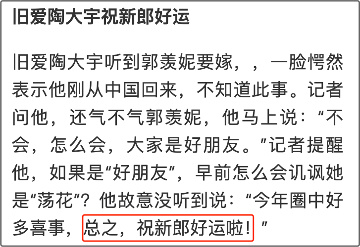 有意思的是,当媒体问陶大宇关于郭羡妮婚事时,陶大宇话里有话的说道: