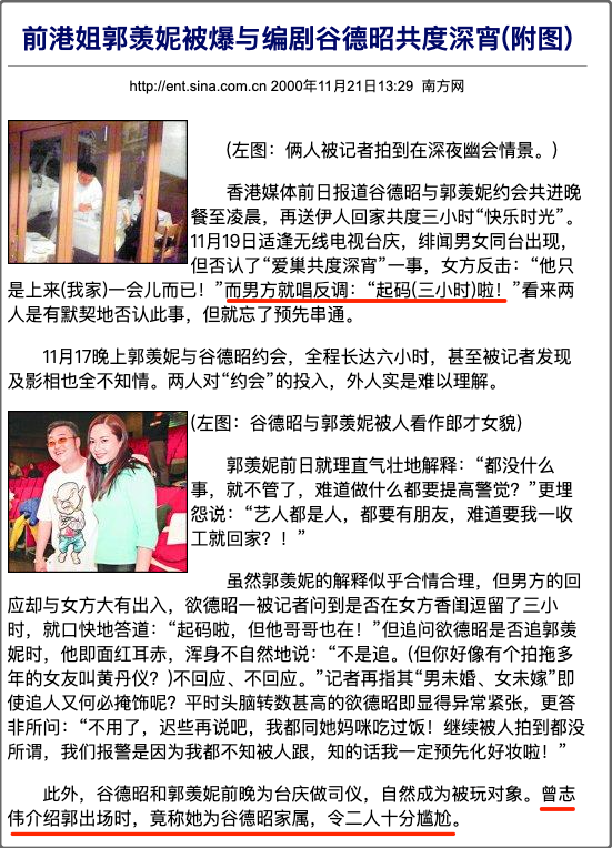 2000年11月19日,谷德昭与郭羡妮共进晚餐至凌晨,然后回到郭羡妮的闺房,一起共度了3个小时的“快乐时光”。