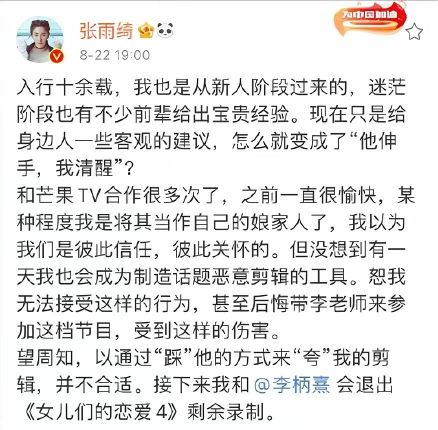 声明最后,张雨绮霸气地表示要退出《女儿们的恋爱》这个节目。