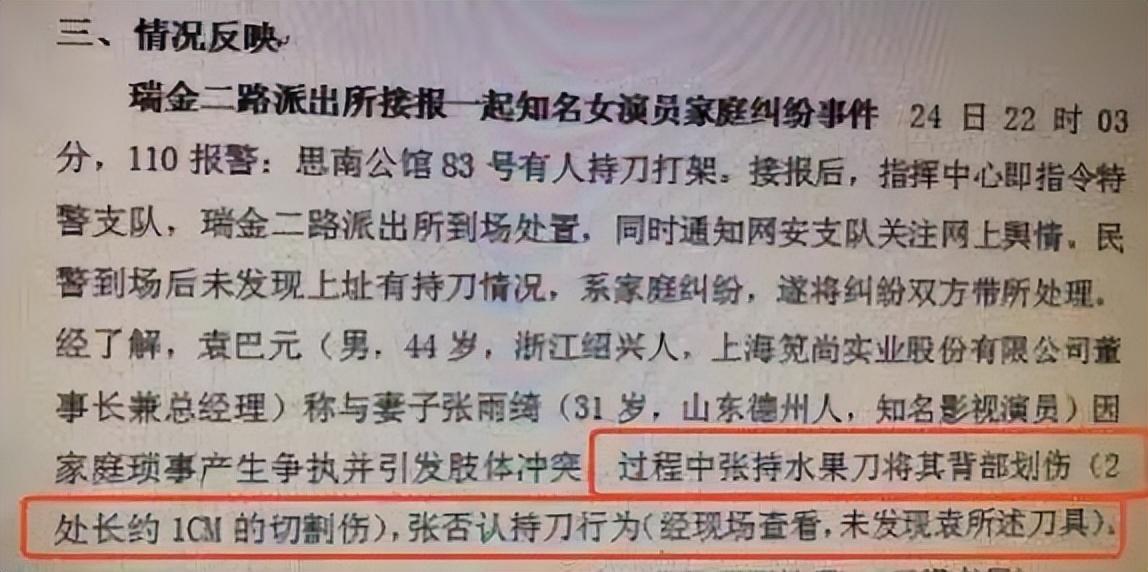 争执过程中,张雨绮拿水果刀,刺伤了袁巴元,最后两人双双到了派出所。