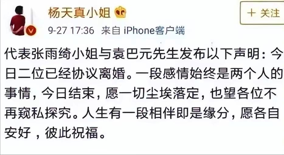 但是一年后,由她的经纪人杨天真宣布,张雨绮和袁巴元离婚了。