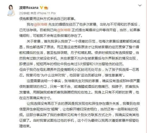 在这篇文章中,漠寒爆料她和张培萌的婚姻出现了问题,在两人结婚之后张培萌多次对自己实施家暴。