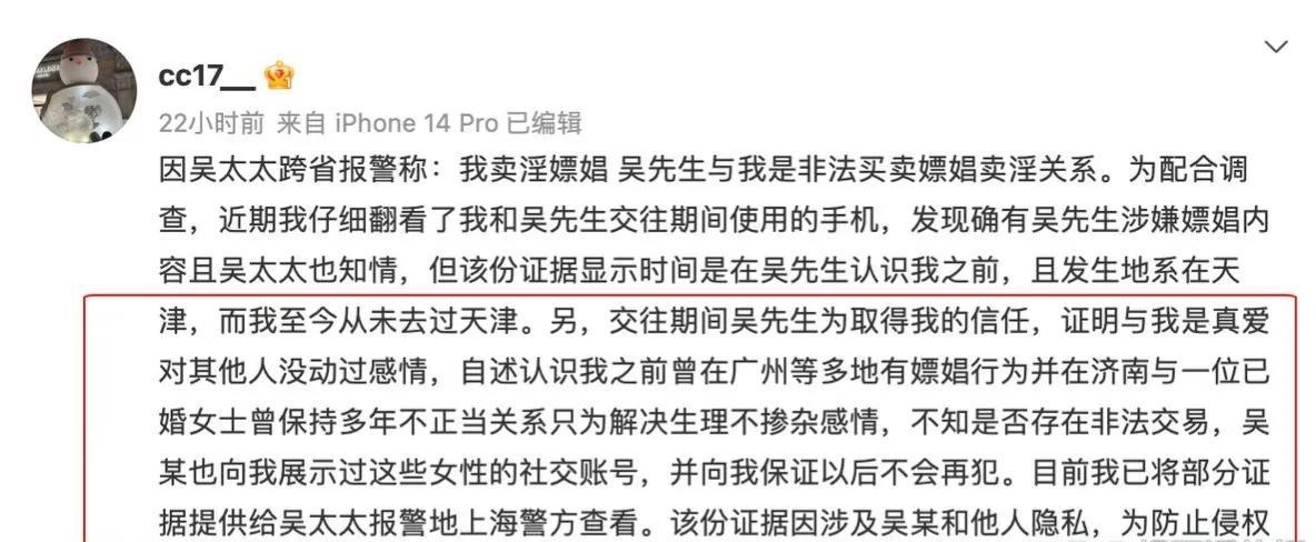 据这位叫陈晨的女士举报,吴兴涵为了让自己放心和他交往,曾给自己透露自己曾经在广州等多地有过嫖娼行为,还和一位已婚女士保持多年不正当关系,只为解决生理问题还掺杂其他任何感情。