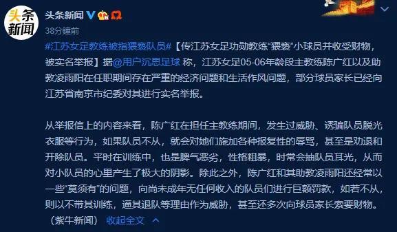 2019年,有一位来自江苏女足青年队的队员举报主教练陈广红猥亵自己。