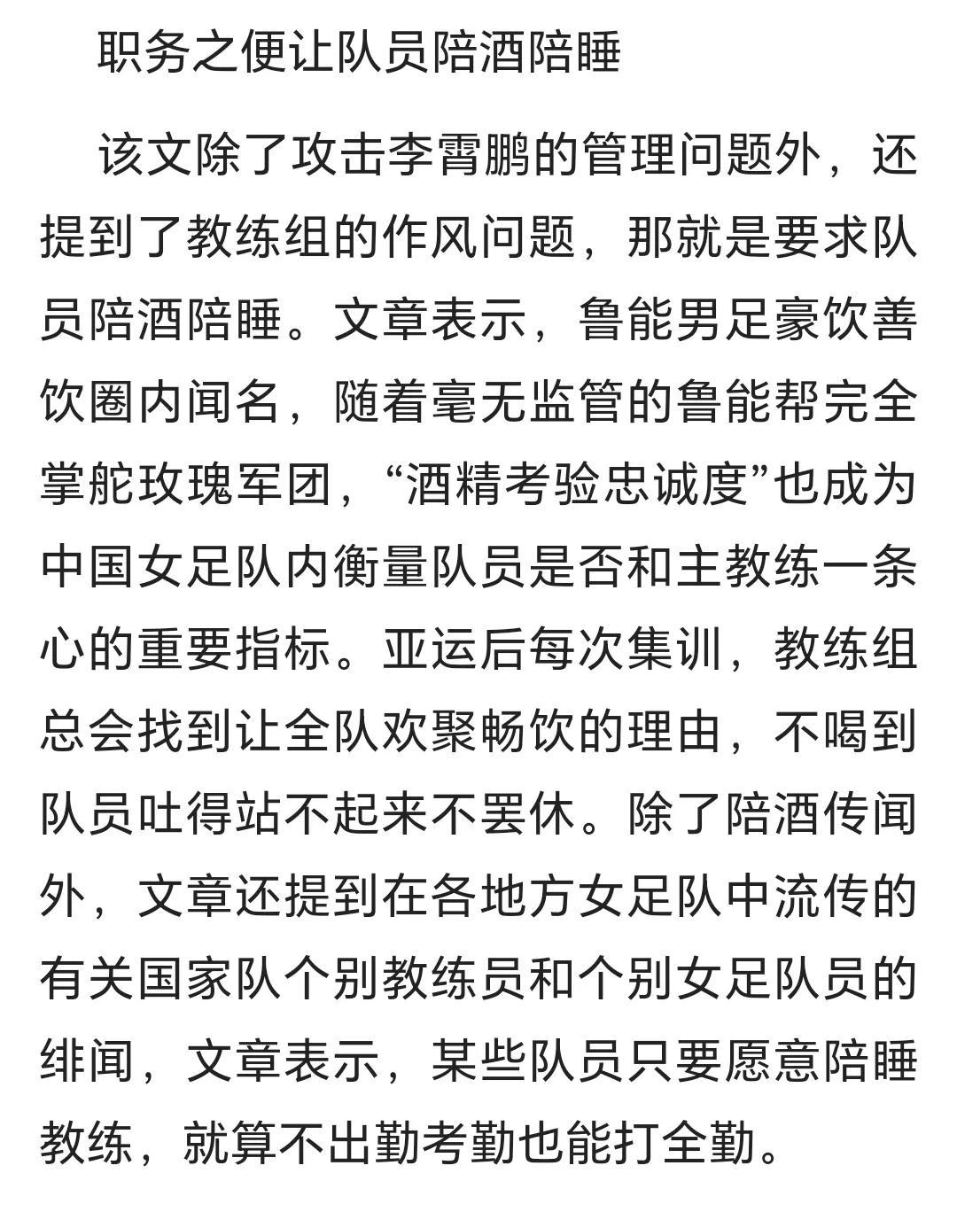 文章中还提到了在各地方女足队中流传的一些国家队个别教练和个别女足队员的绯闻,隐晦的说有些队员只要愿意陪睡教练,就算不出勤也能打全勤。