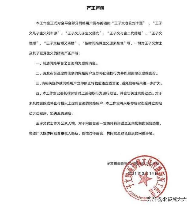 随着事情的发酵,王子文工作室发文否认了孩子生父是刘丰源,并且表示王子文没有结婚,关于孩子生父的言论,网络上的传言皆为虚假消息,若还有人继续传播不实言论,将会采取法律手段进行维权。