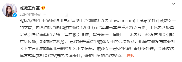 面对如此情况,戚薇方面反应迅速,辟谣该爆料为不实传言,并已经委托律师事务所通过法律方式追究相关人的责任。