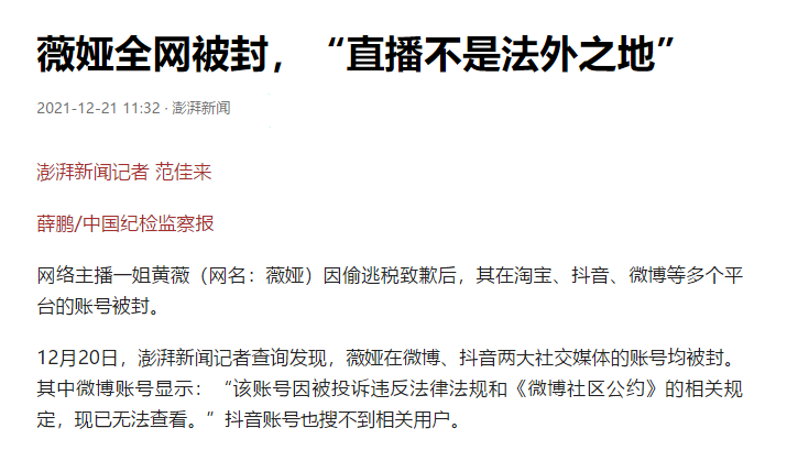当然,薇娅也为她的违法行为付出了惨痛的代价,她从励志人物变成了负面人物,全网账号被封。