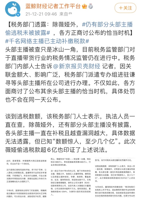 如今随着薇娅被处罚,上千名网络主播主动自查补缴税款。