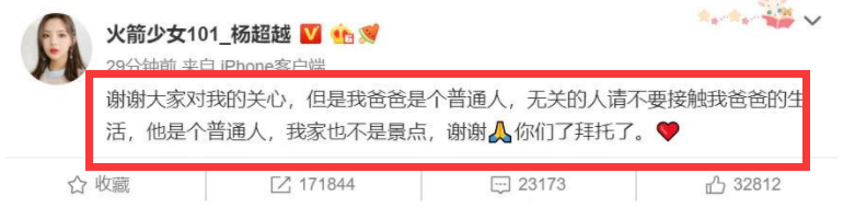 已经严重影响到杨爸爸的生活,为此,杨超越不得不在社交平台上呼吁:谢谢大家对我的关心,但是我的爸爸是个普通人,无关的人请不要接触我爸爸的生活,我家也不是景点。