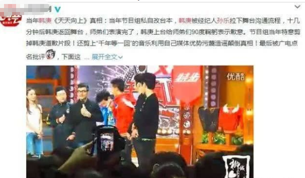 节目中的这个环节,是突发的,并没有出现在经纪人孙乐的脚本里面,在台上临场应变的韩庚没有发火,孙乐这个经纪人却冲到后台破口大骂节目组: