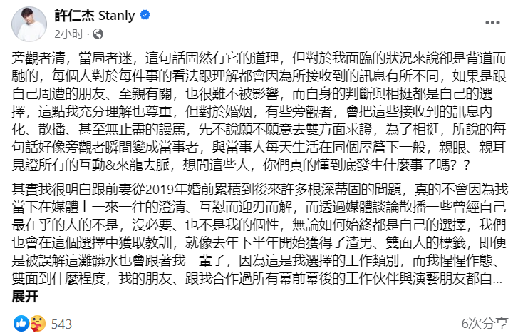 面对亚希干哥哥的指控,许仁杰稍后发了长文进行回应,并承认跟亚希已经离婚。