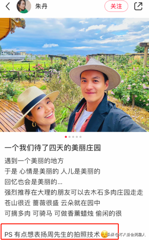 前段时间,朱丹跟周一围出游,还专门晒了合照秀恩爱,文案里一口一个“周先生”,连周一围拍张照片也要夸。