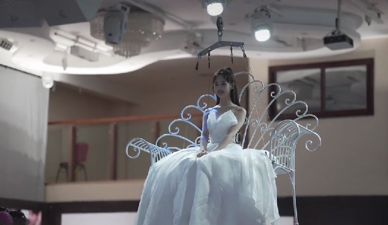 秦牛正威的出场方式很有特色,她穿着圣洁的婚纱坐着飞椅从远处而来,梦幻得好似童话世界里的公主。