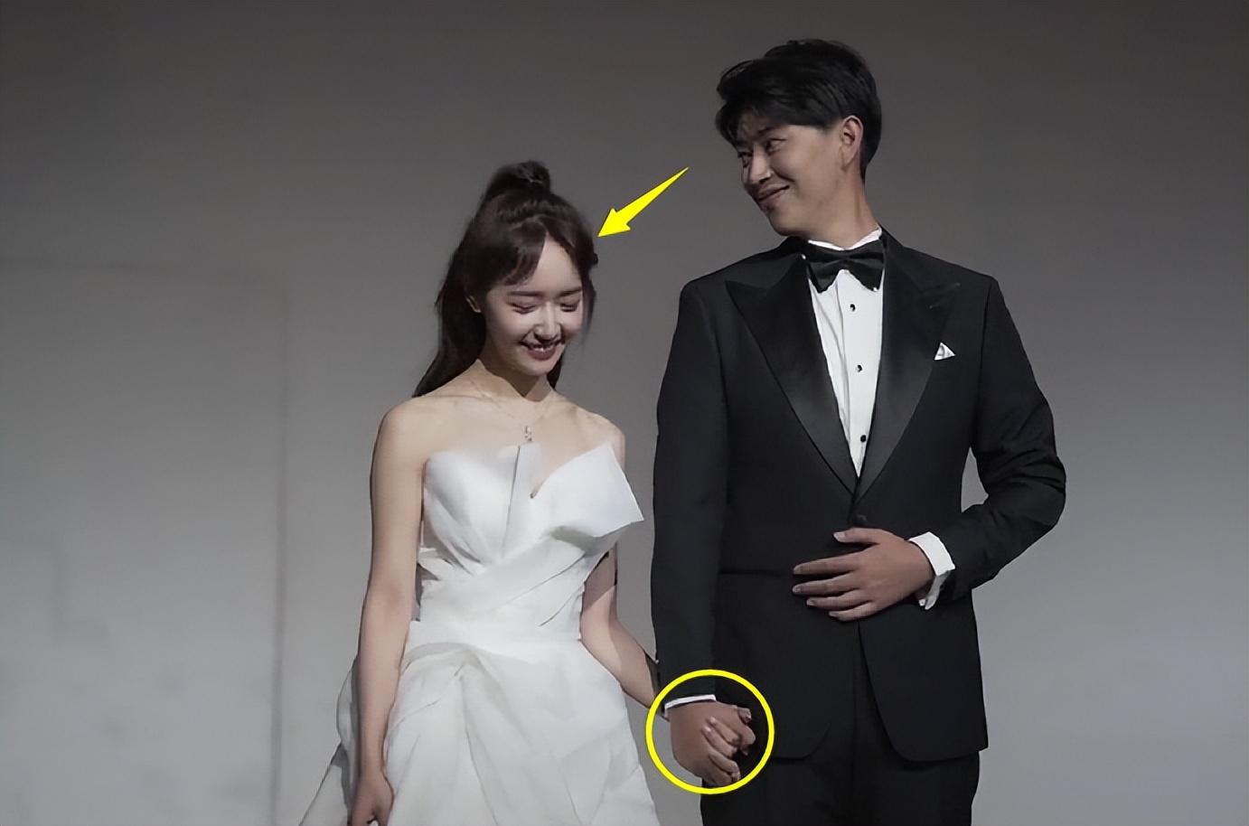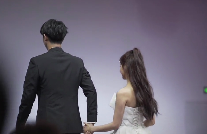 之后两人牵手走向舞台,期间双手一直紧扣,男方眼神深情,女方表情娇羞 。