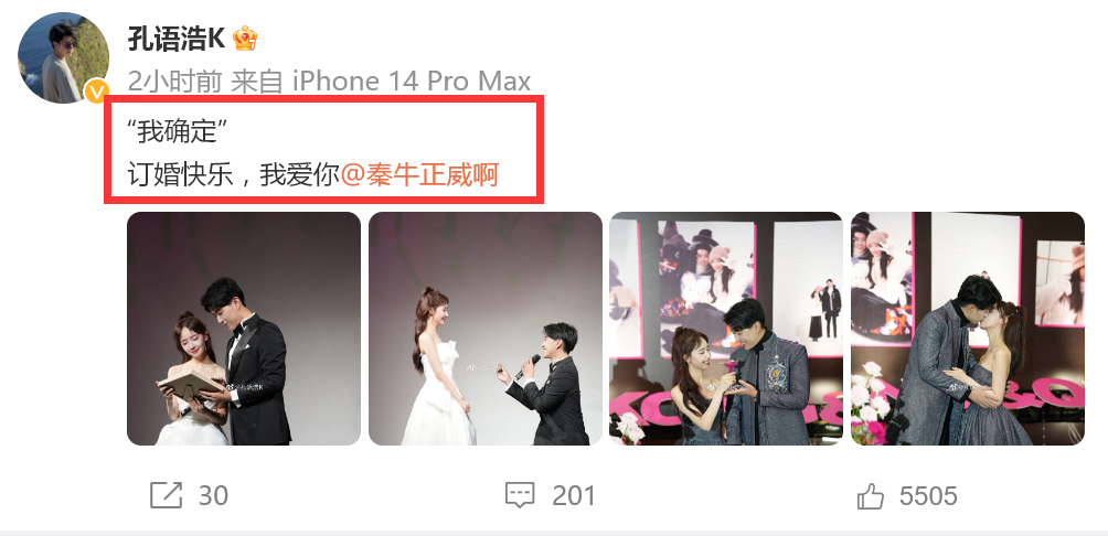 当天下午,秦牛正威和男友孔语浩双双发布订婚现场的照片,一个说“我确定”,一个说“我愿意”,并喊话对方:“订婚快乐,我爱你”。