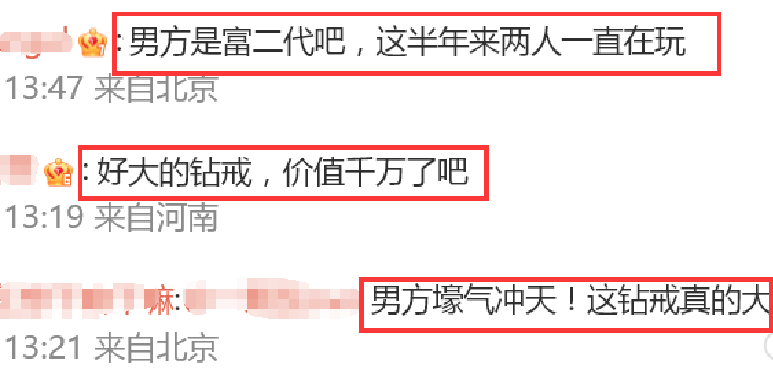有网友表示男方壕气冲天,这个钻戒起码价值千万;而且两人官宣恋情后的半年时间一直在四处旅游,由此不难看出男方应该是 “富二代”。