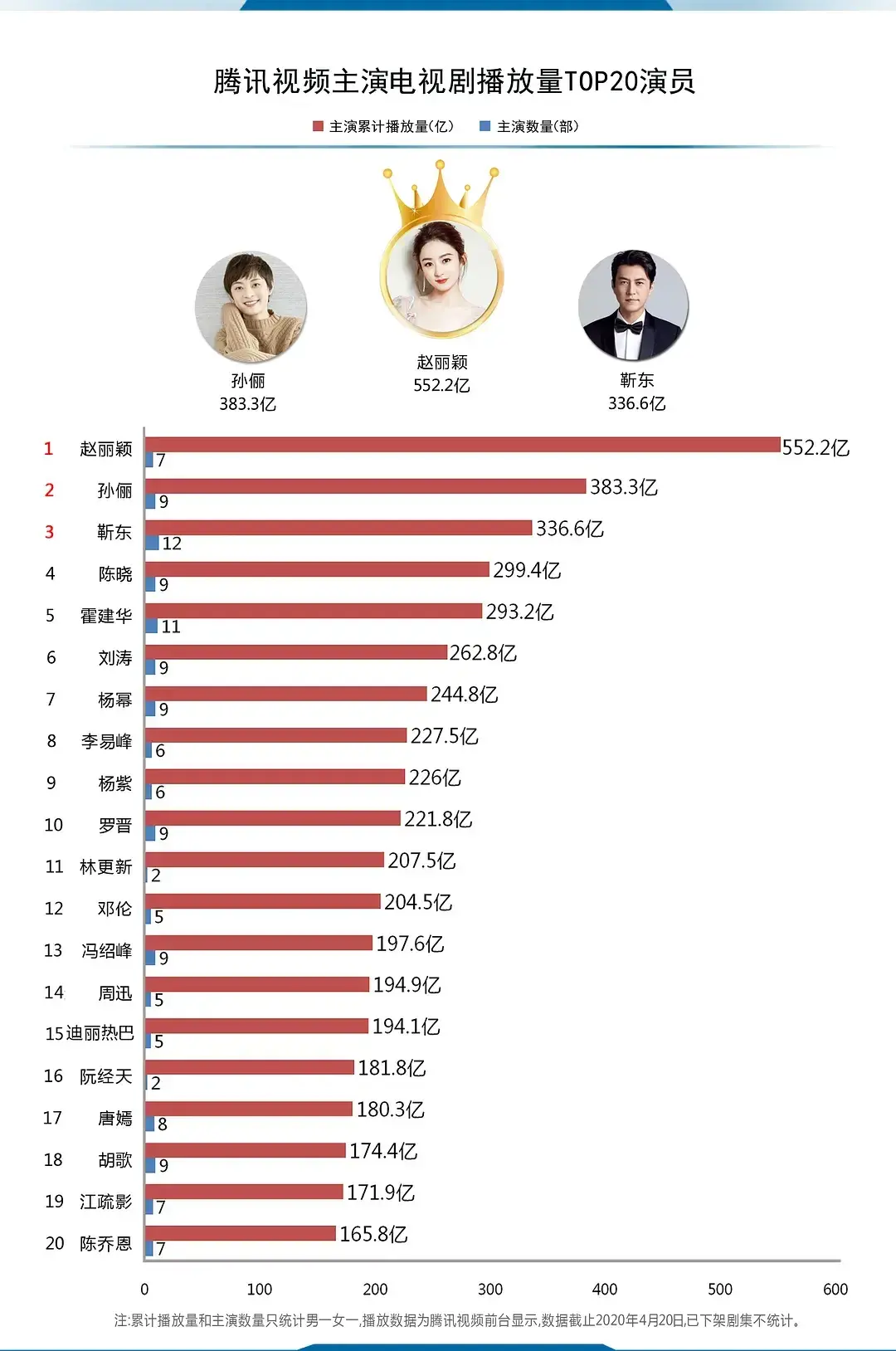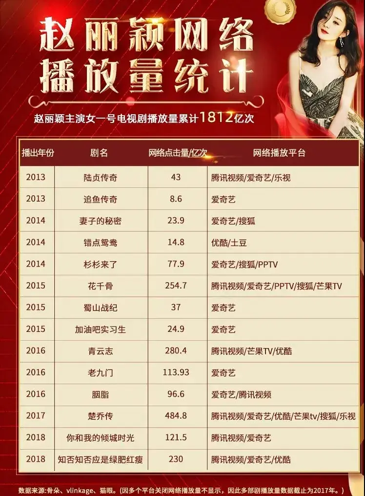 腾讯网播量:赵丽颖550亿+,排名第一;杨幂240亿+,排名第七。
