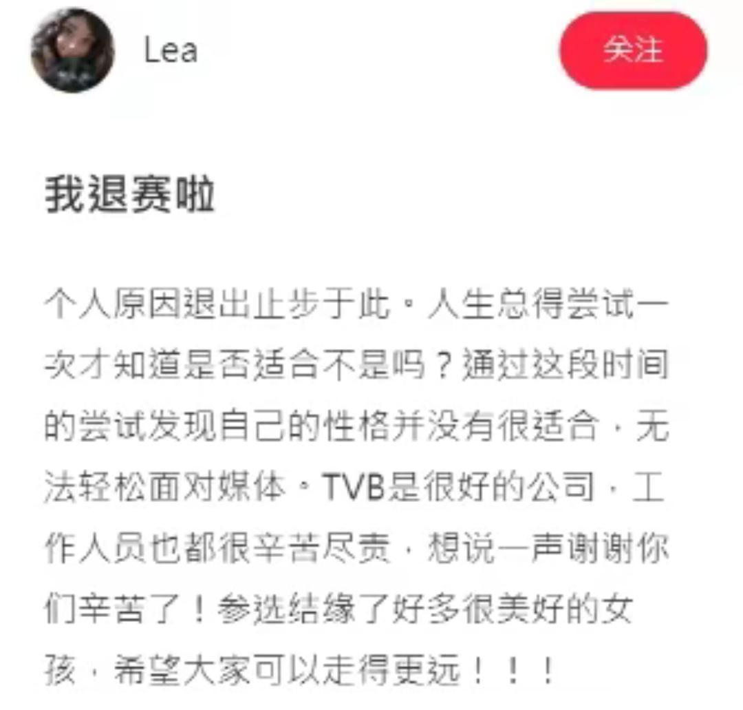 贺怡雯在社交平台发文称“个人原因退出止步于此,通过这段时间的尝试发现自己的性格并没有很适合,无法轻松面对媒体,希望大家可以走得更远”。
