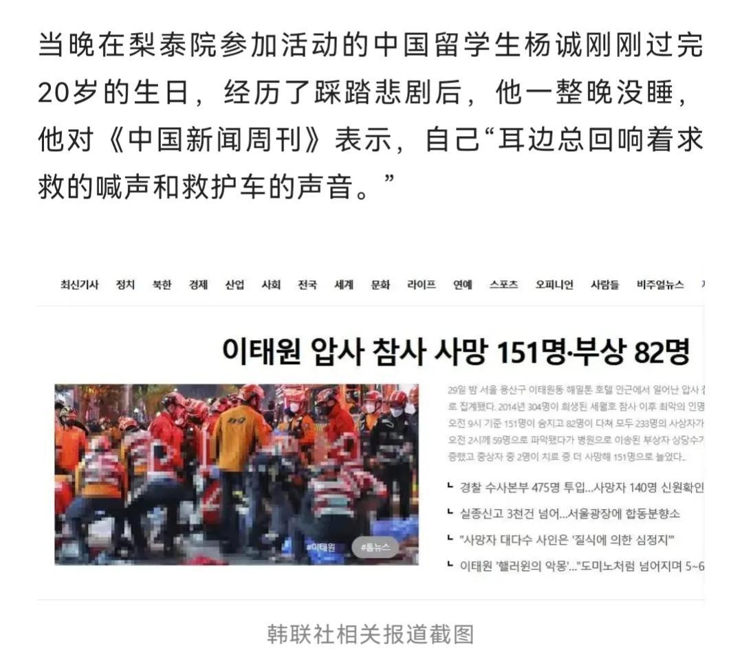 而另外一位在梨泰院踩踏事故现场逃离出来的中国留学生杨同学则表示,他是好不容易挤出了人群,多亏朋友一直拉着他的手,才把他成功带出来。到现在为止,杨同学耳边里仍然回响着事故现场人们发出的救命的声音,以及救护车呼啸而过的声音。