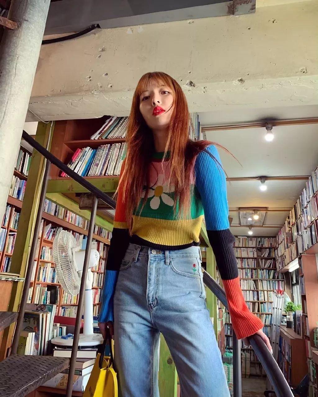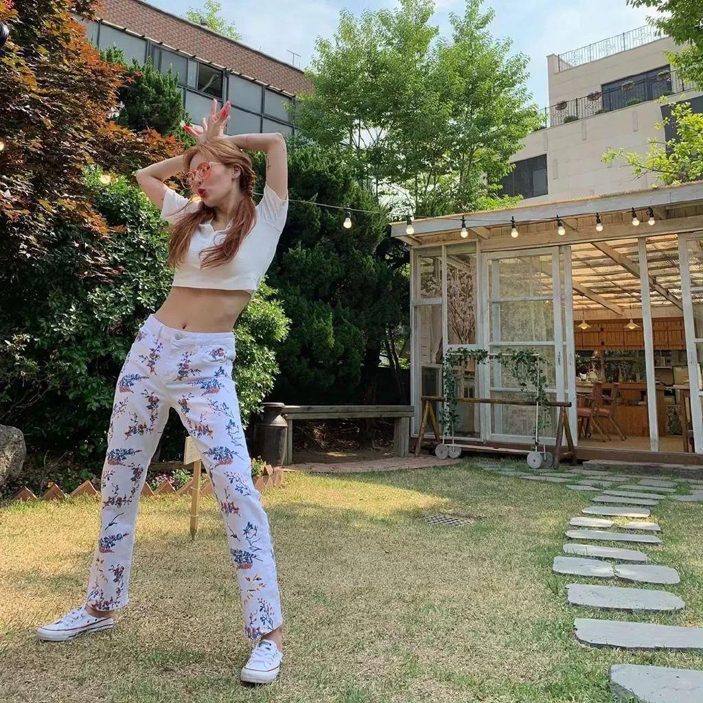 各种露脐装当属泫雅的最爱,白色露脐T恤搭配印花长裤简单时尚,蕾丝小吊带搭配牛仔长裤火辣性感。