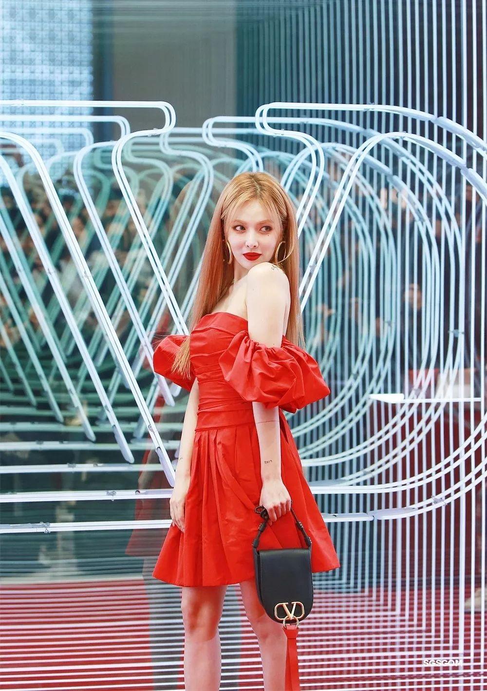 白色蓬蓬袖连衣裙清纯可爱,红色连衣裙则性感惹火,果然是迷人的小妖精泫雅没错了~