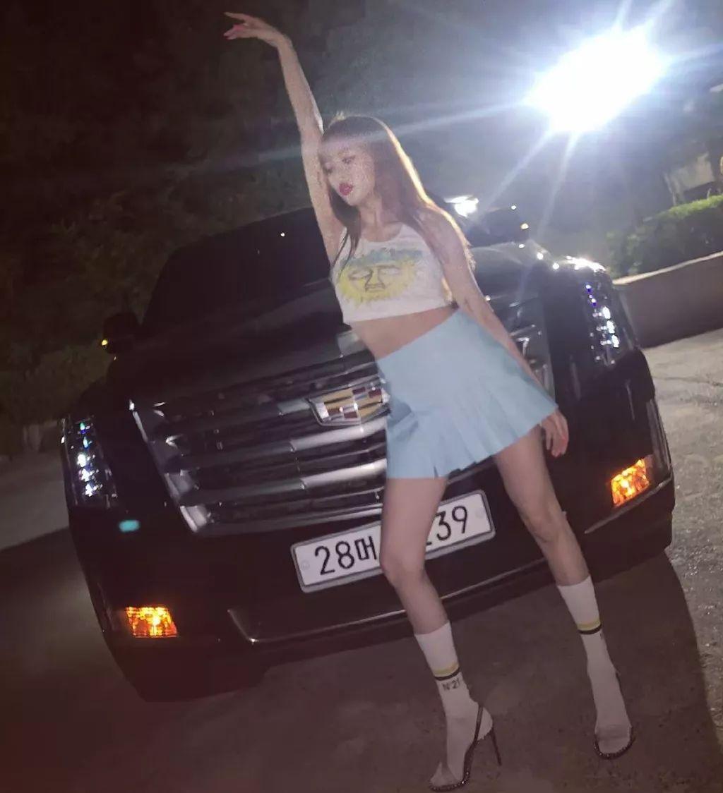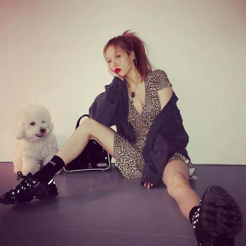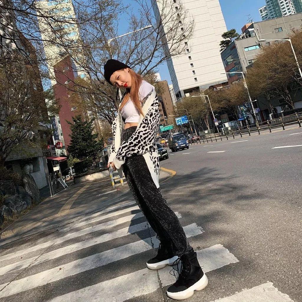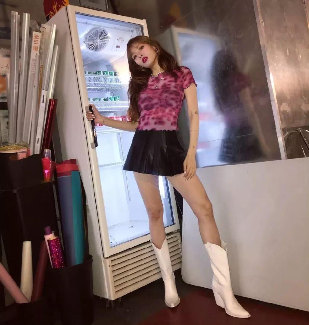 白色小吊带搭配豹纹半裙性感十足,绑带款高跟鞋更是只有泫雅这样的腿精才能hold得住,粉色短款T恤搭配银色半裙则青春时尚。