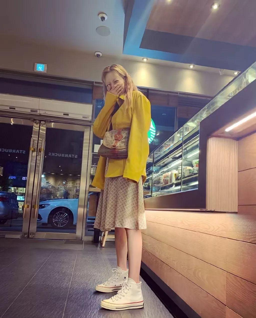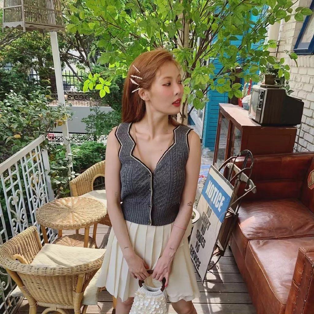 白色T恤搭配白色小短裙简单时尚,外搭针织小背心极具个人特色,灰色针织背心搭配白色百褶裙同样充满了泫雅的个性时尚。