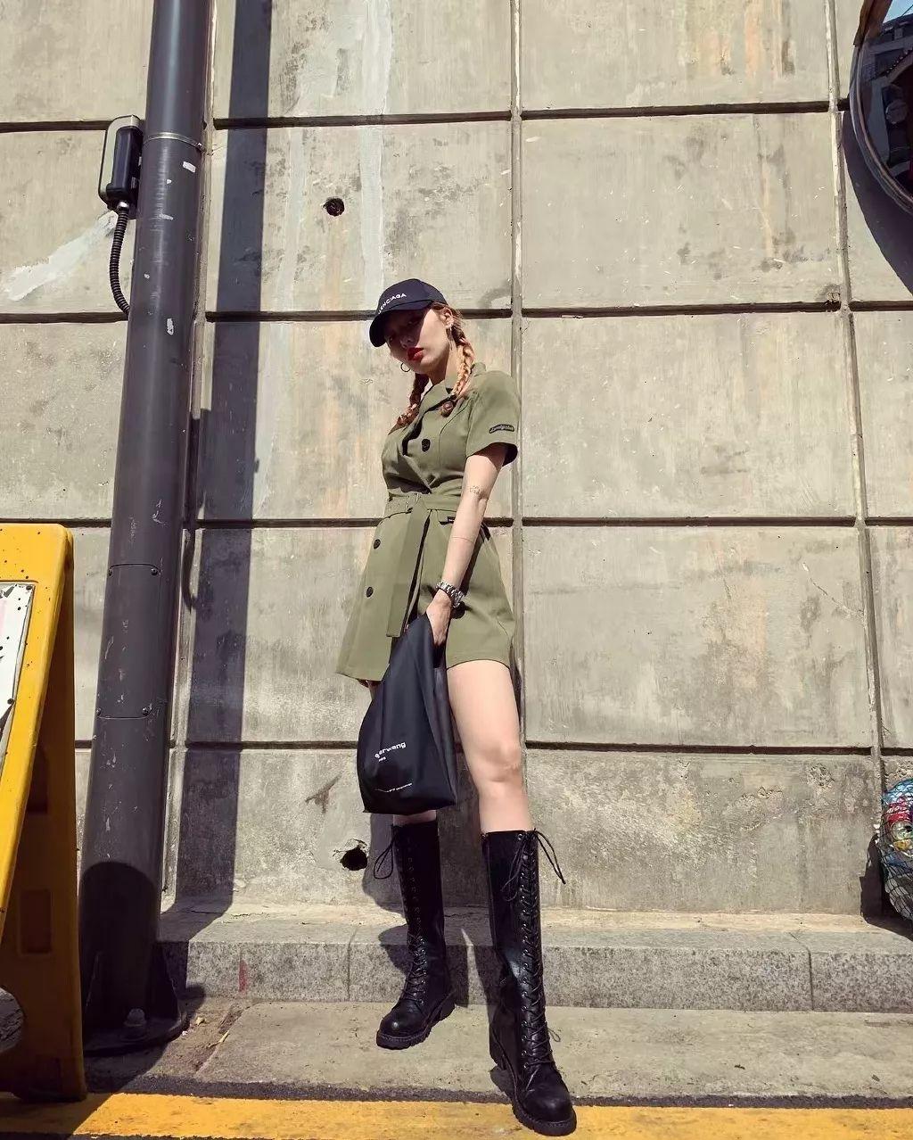 oversized款西服可以直接做连衣裙穿,演绎下半身失踪的性感风格,而军绿色连衣裙搭配黑色长靴则帅气迷人。