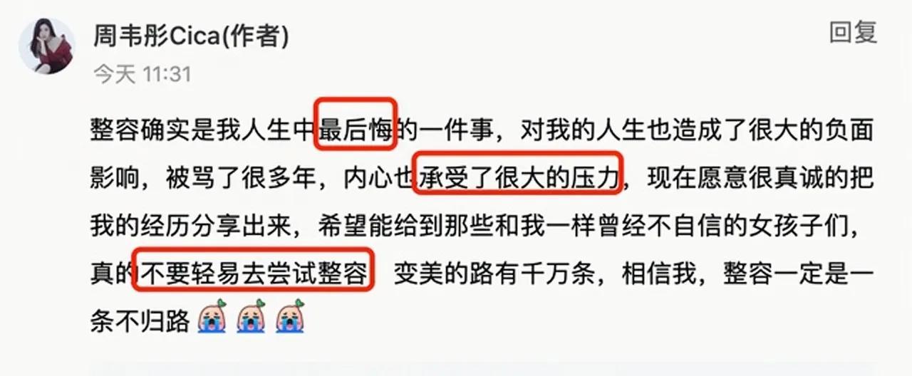 女神周韦彤明明可以靠身材走红,最后因为整容而遭受了太多压力。