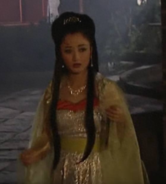 3、狐狸精第三个出场的服装是宫中的常服,金灿灿的裙子搭配淡黄色的纱衣,配上金灿灿的项链和头饰,看上去格外娇俏可人。