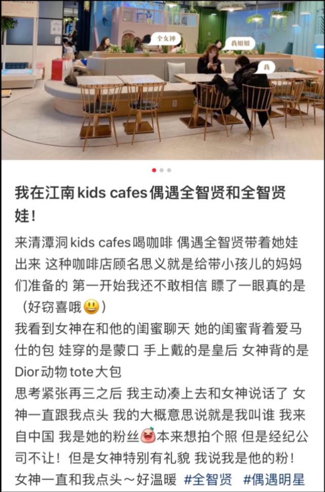 2022年3月22日,有网友分享动态直言偶遇全智贤带她的娃出来喝咖啡,因为全智贤带着俩儿子,所以精心选了一家专门给带小孩妈妈准备的咖啡店,与全智贤一起的还有闺蜜以及经纪人,因为女神的高颜值,很快就将周围喝咖啡的路人吸引,这位网友还专门打量了全智贤及孩子,一家人都身穿名牌,儿子更是手戴名贵手表,从小就被全智贤富养。