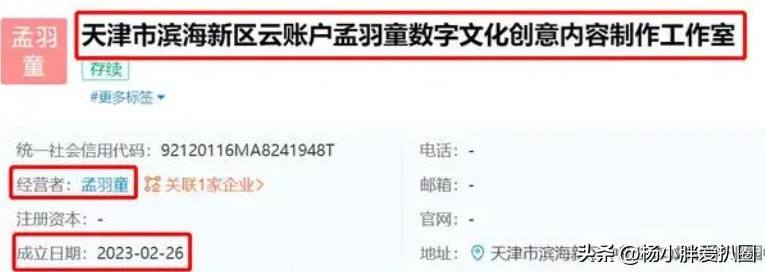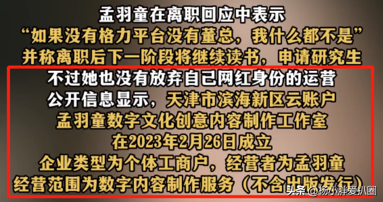 查阅信息发现,孟羽童在离职前2个月,就已经注册了个人工作室,用于运营自己的网红身份,可见她这是打算自立门户,转行当网红了。