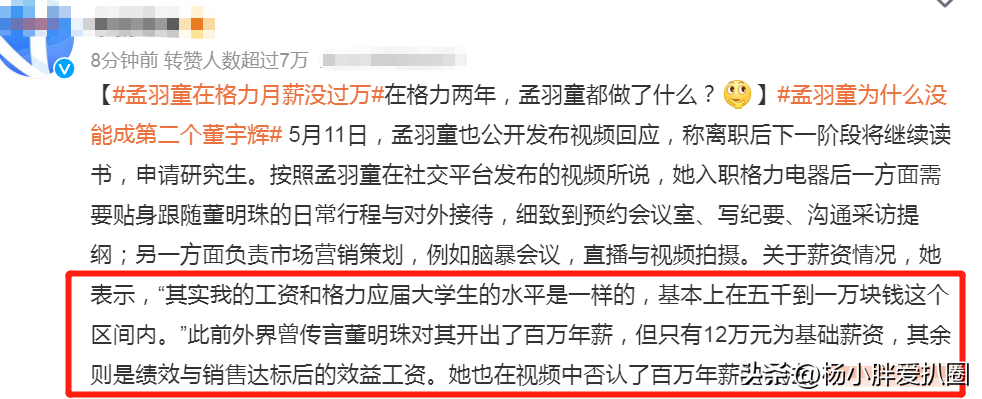 5月12日,孟羽童再次更新动态,她否认了自己从格力拿到百万年薪的传闻,称自己赚不到那么多钱,引起诸多网友关注。