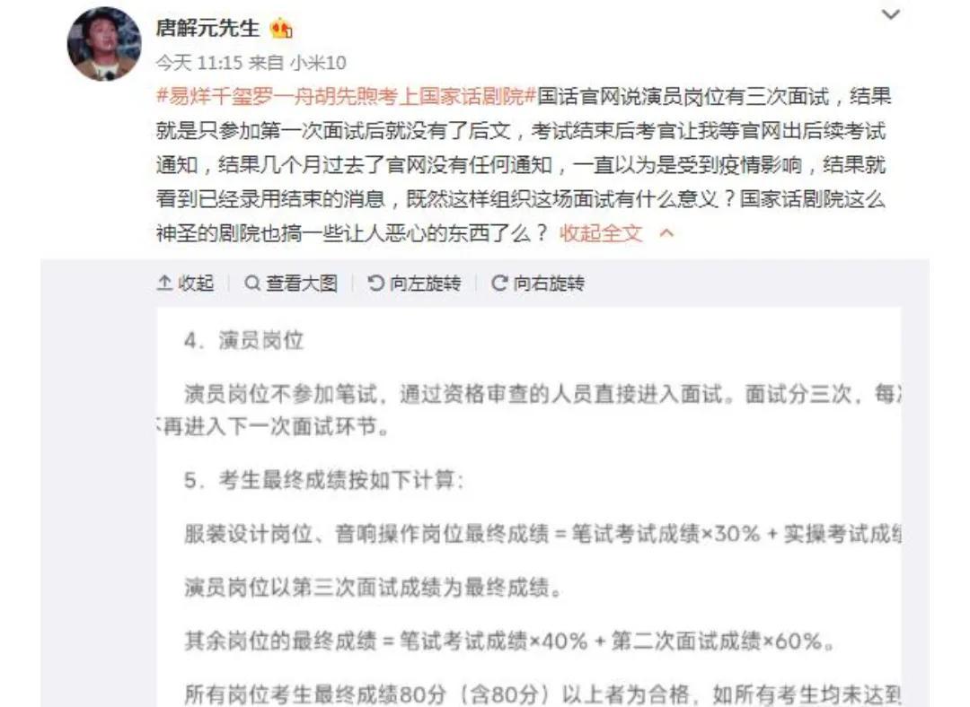 本来三位明星免笔试已有争议,如今连面试的过程都被省略。网友们开始议论纷纷,合理怀疑考试过程的公平公正性。并且国家话剧院招聘的要求明明写着“非在职人员”,而这几个明星都是有“工作”的,为什么还可以入选?