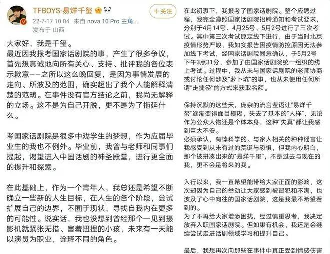 事情持续发酵,易烊千玺考上国家话剧院编制的事情引起了社会各界的关注。