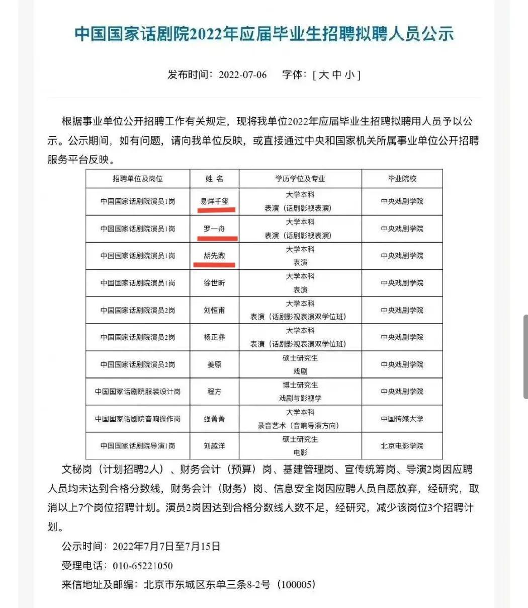 原来,事情的起源是2022年7月6号,中国国家话剧院公开2022年应届毕业生招聘拟聘人员名单,易烊千玺、罗一舟、胡先煦等在列。