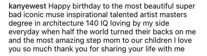 还配了一大段话为妻子庆生:" 祝最美丽、最坏的、最有标志性的缪斯、最鼓舞人心最有才华的艺术家、建筑学硕士、智商 140 的人生日快乐,当半个世界的人都背弃我时,她依然在我身边,我孩子们最了不起的继母,我非常爱你,感谢你与我分享你的生活。"