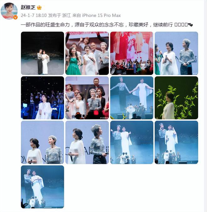 1 月 7 日晚,演员赵雅芝在个人社交平台分享了一组 " 新白娘子传奇 30 周年演唱会 " 的高清照片,她还感性发文:" 一部作品的旺盛生命力,源自于观众的念念不忘,珍藏美好,继续前行 "。