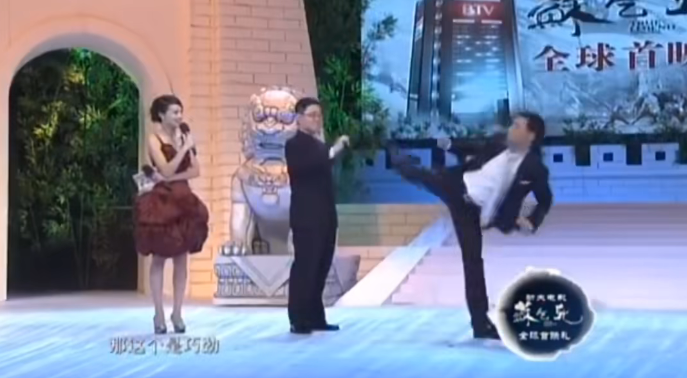其实原本赵文卓想要踢的是张绍刚的眼镜,表示自己可以在不伤到脸的情况下将眼镜踢掉,不过考虑到怕把眼镜踢坏,这才退而求其次,表演了一把踢话筒套。